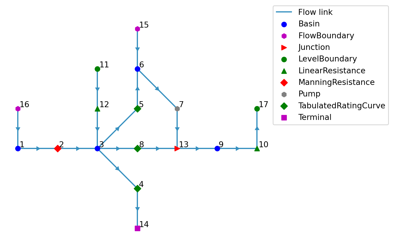 nmodel = parse(model, graph, substances)The parsed model is identical to the Ribasim model, with the exception of the added concentration_external table that contains all tracer results from Delwaq.