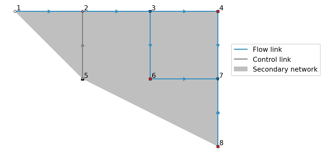 DiscreteControl switches at basin level 0.5: - Below 0.5: allocation-controlled (allocation decides flow) - Above 0.5: prescribed flow